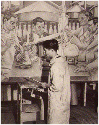 左の写真は1936年、ニューヨーク市のウイラード・パーカー・ホスピタルの壁画を制作している鈴木盛さんの写真です。 壁画名は「Preventative Medicine」