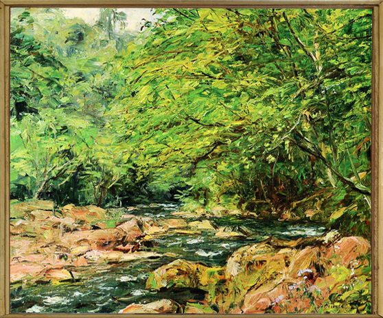 Jin Osakabe paints in a realistic style. He is a master with both the brush and the painting knife. When asked why he did not travel to Europe, Mr. Osakabe smiled and said that there were many good landscapes in the Kyoto and Nara area which he still did not have time to paint.