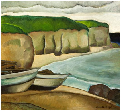 初期の絵としてはやはり「マンドリンを持つ男」になるでしょう。又1937年の「無題」(ビーチコーブボート)がみられます。両者は人物と風景の違いはありますが、盛り上がった腕や手、山や舟の捉え方。緑、茶、ブルーと新鮮な色。若々しい力に満ちた筆致。許山さんのアメリカンモダニズムの典型でしょう。