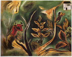 ある時は幻想風なプリミティブな子どもや牛の風景を、ある時期には憂いを帯びた表情の女性達、あるときは仮面に表れた悲哀など、国吉の画業に物語られています。