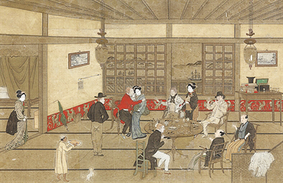 川原慶賀の後、タントにより描かれた長崎の大邸宅の室内情景です。ヨーロッパ人と日本人の紳士がテーブルの周りに座り、飲み物を飲んでいます。3人の日本人の娘と1人の使用人も描かれ、小さな犬が手前で飛び跳ねています。大きさは18 インチX 27インチ (45.7 X 68.6 CM.) で、艶消しのシルクを施した木製の額に収められています。